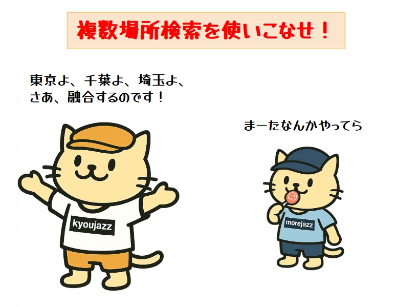 ◆「今日ジャズ検索」では、下のシンプルな検索フォームから、その日・その場所を指定して簡単に絞り込むことができます。