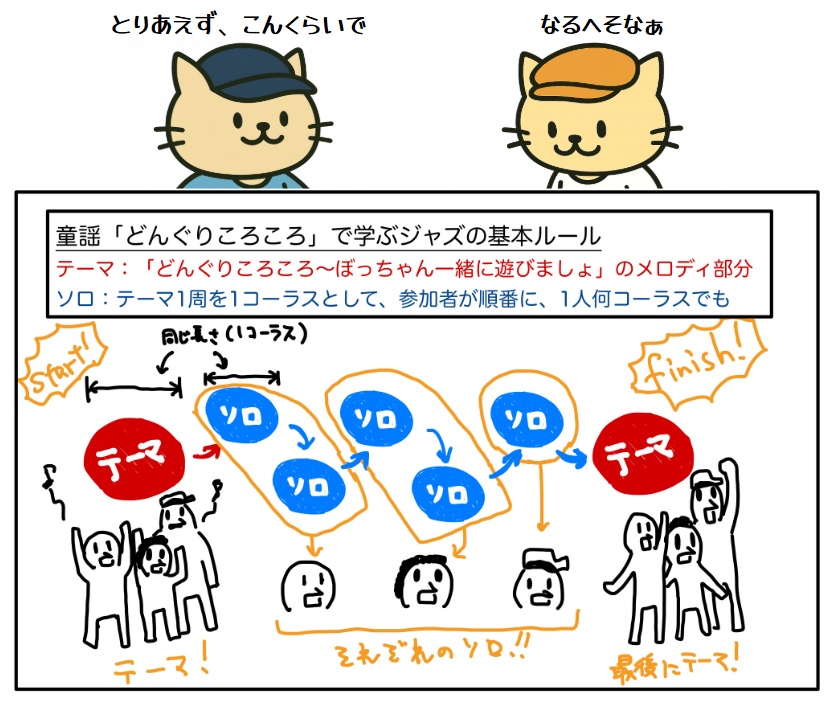 ・ソロの部分では、テーマ1回分を1周として、参加者それぞれが順番に何周も即興演奏を行い(醍醐味)、
